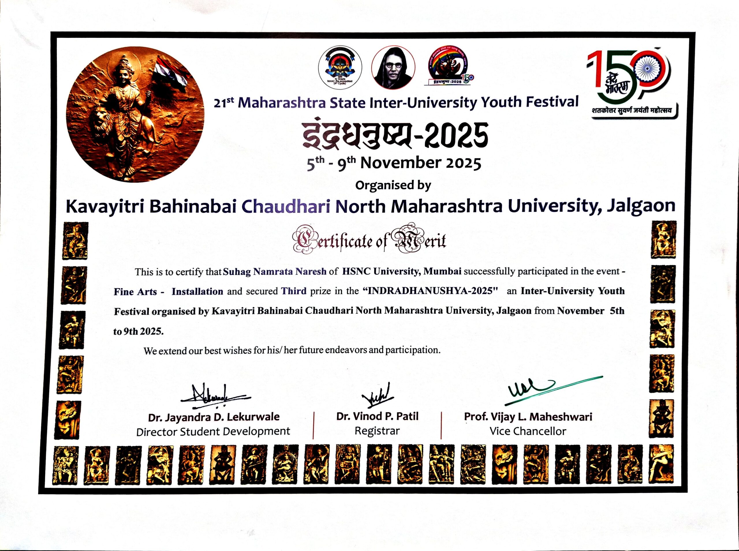 | Namrata Suhag | 21st Maharashtra State Inter-University Youth Festival, Indradhanuysha- 2025 held at Kavyaitri Bahinabai Chaudhari North Maharashtra University, Jalgaon | Third | 5th to 9th November 2025 | View |